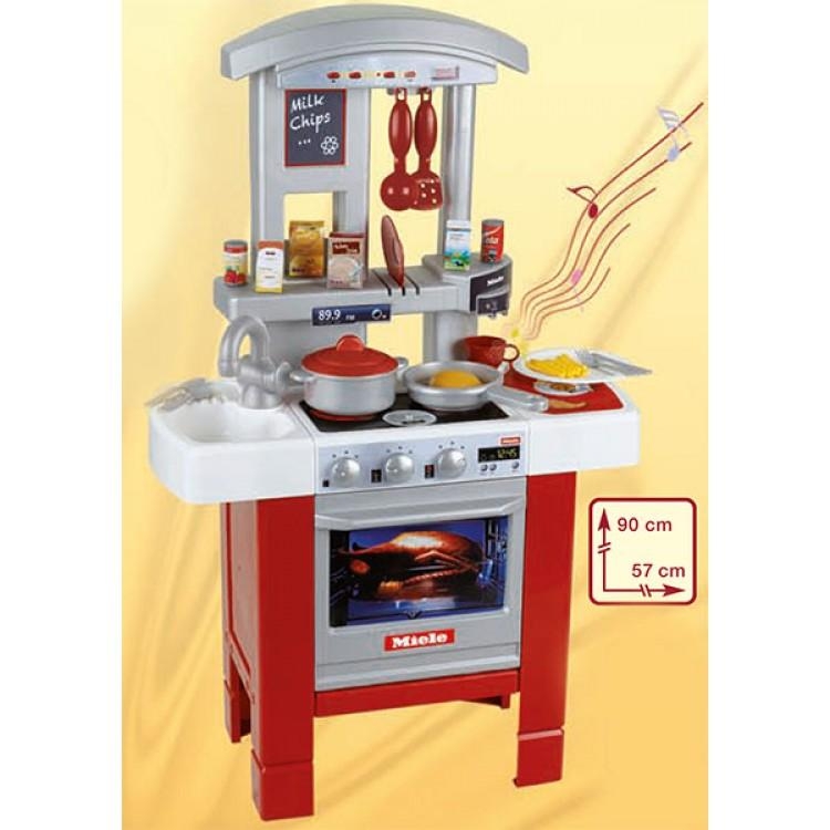 Kuchnia powstała na licencji firmy Miele, dlatego też jest wierną kopią prawdziwego urządzenia tej marki. Zabawa może odbywać się po obu jej stronach, co daje łatwy dostęp do poszczególnych akcesoriów zestawu. Urządzenie posiada imitacje zmywarki czy piekarnika. Zestaw zawiera aż 20 elementów akcesoriów, przyborów kuchennych, czy naczyń stołowych, a w tym garnek z przykrywką , patelnię, biały talerz ze sztućcami, czerwoną filiżankę z podstawką, chochlę, łopatkę kuchenną, a także imitację opakowań przypraw, kawy, śmietanki do kawy, czy porcji kurczak i frytek. Na okapie kuchni znajdują się wygodne uchwyty do zawieszenia wszystkich akcesoriów kuchennych. Imitacja elektrycznej płyty kuchni Miele wydaje odgłos gotowania, gdy tylko ją włączymy i postawimy na niej garnek lub patelnię. Zarówno piekarnik jak i zmywarka otwiera się, a ich wnętrze oprócz imitacji piekarnika czy zmywarki także może posłużyć jako skrytka na akcesoria kuchenne, które można tam schować i zamknąć po skończonej zabawie. Ponadto kuchnia Miele posiada jeszcze mały zlew z baterią, do którego możemy wlać wodę. Kuchnia nie nagrzewa się i nie nagrzewa podczas zabawy żadnych przedmiotów które dziecko jest w stanie na niej położyć. Wielkość i waga są dopasowane do potrzeb oraz rączek dziecka. Poprzez gotowanie i zabawę tą kompaktową kuchnią dziecięcą oraz podawanie do stołu dzieci rozwijają swoje umiejętności motoryczne i pobudzają wyobraźnię. Zabawka wymaga użycia baterii, które nie są zawarte w zestawie.