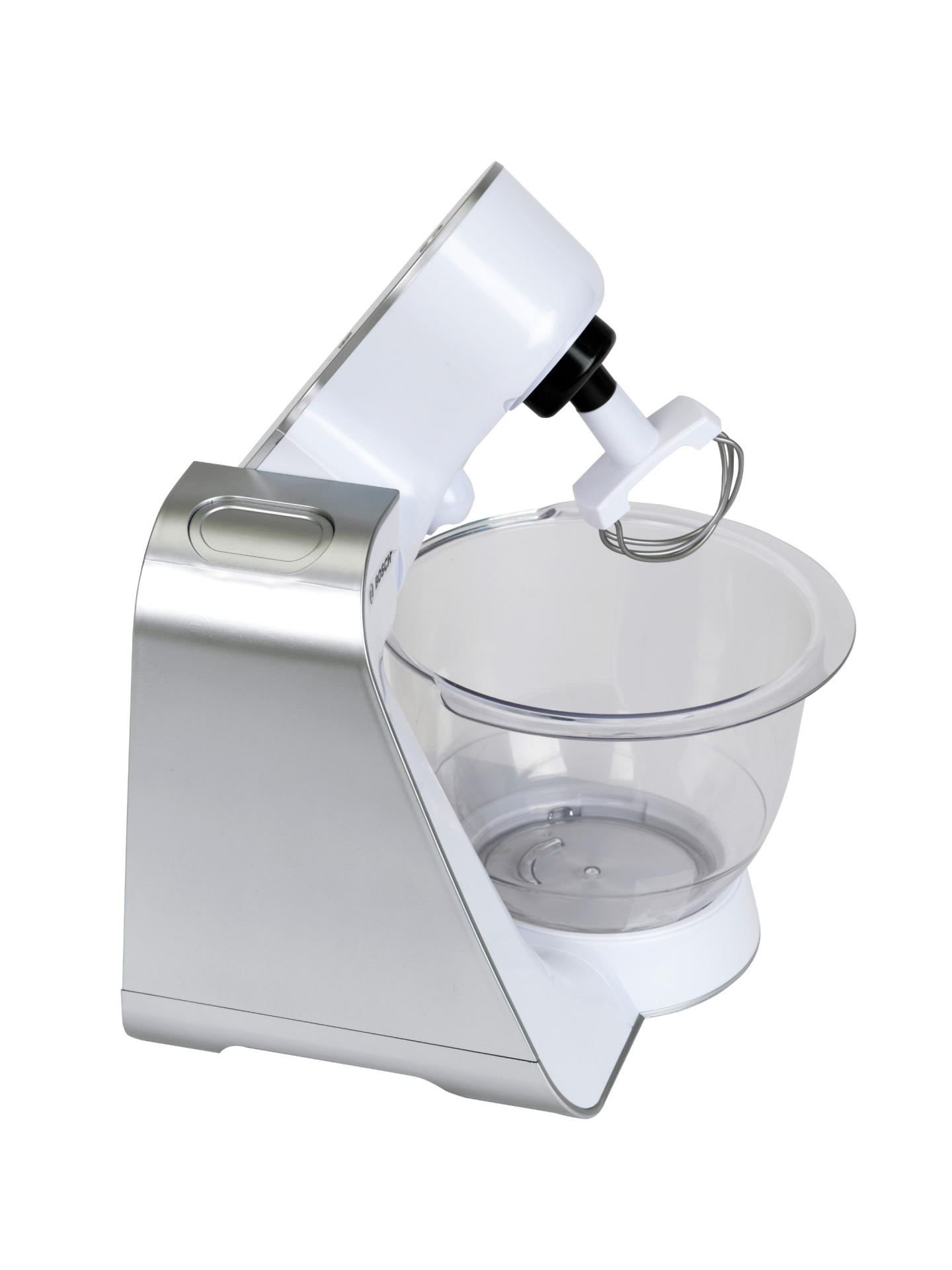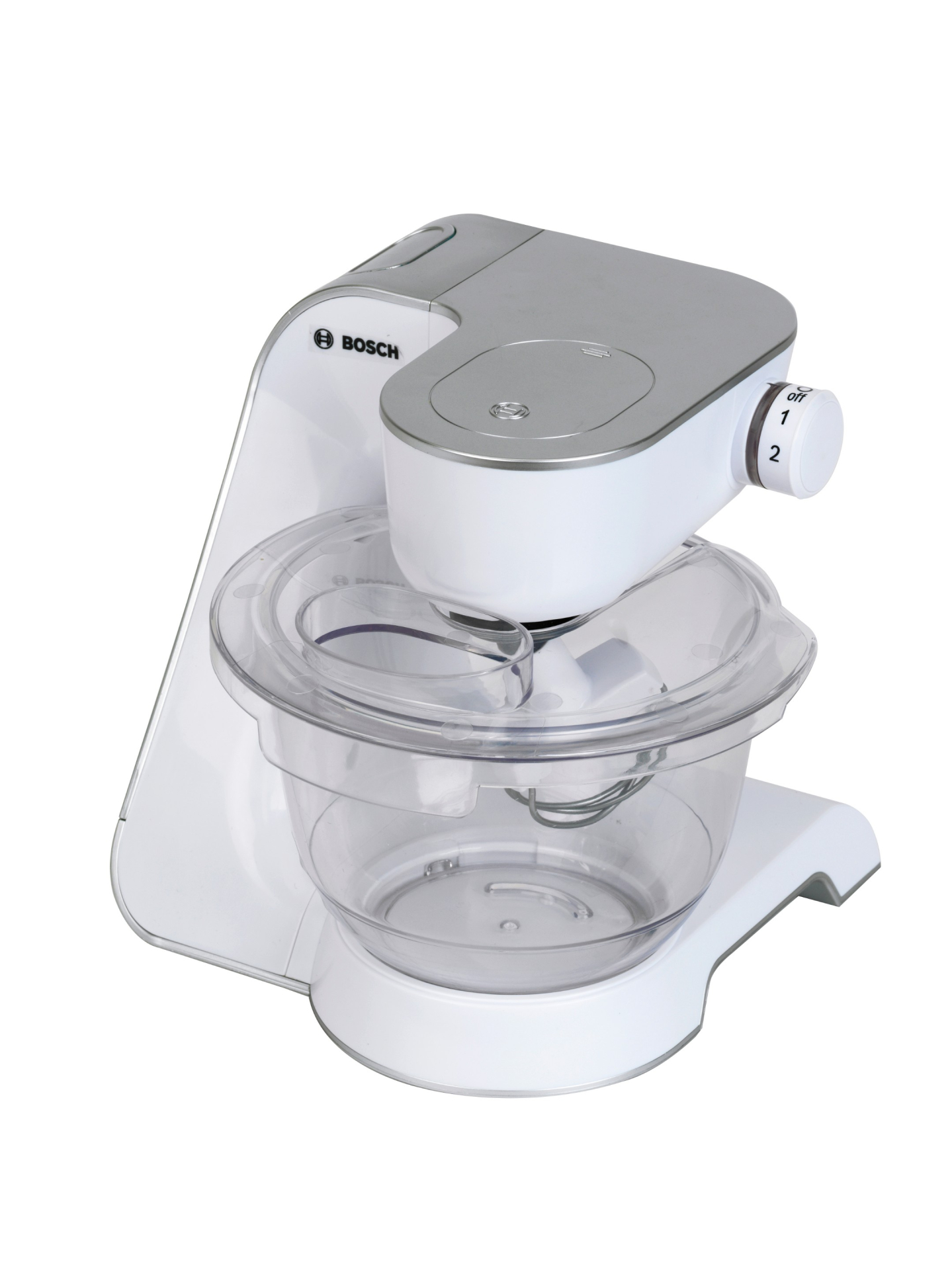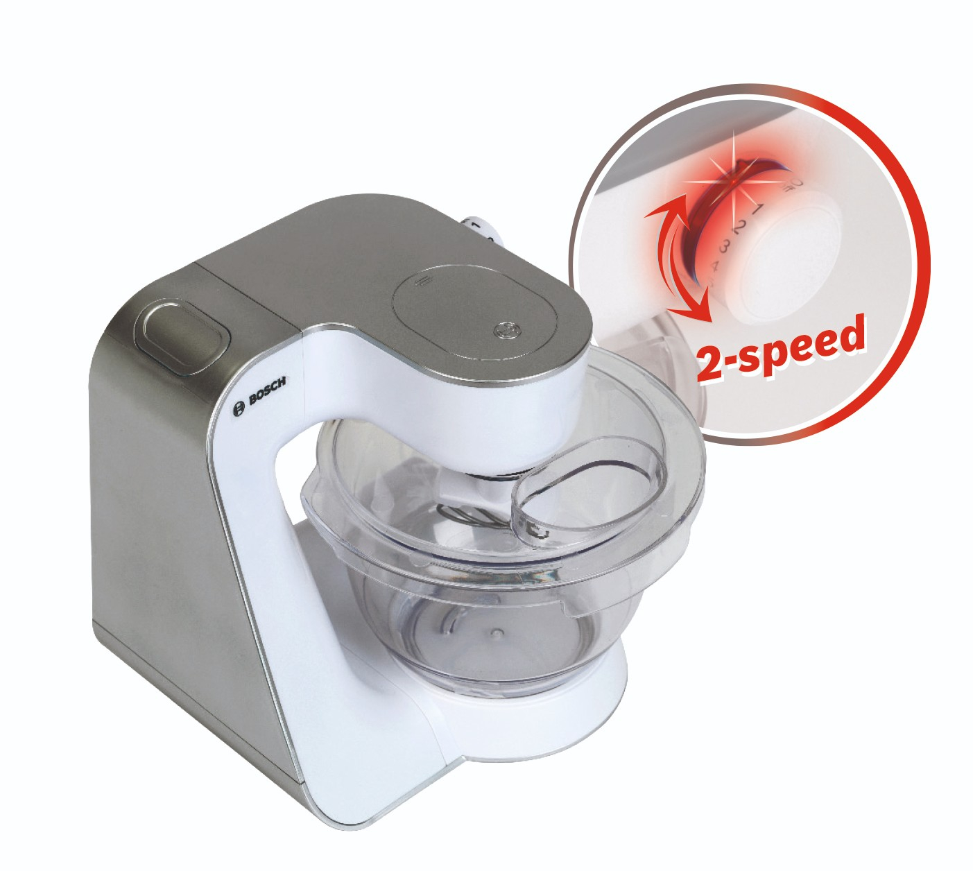 Robot kuchenny Klein powstał na licencji Bosch, dlatego też są wierną kopią prawdziwego urządzenia produkowanego przez tę firmę. Firma Klein od lat produkuje odpowiedniki prawdziwych narzędzi i akcesoriów AGD, przeznaczone do zabawy dla najmłodszych. Robot kuchenny jest srebrny i idealnie nada się do każdej dziecięcej kuchni, a także zapewni ciekawe urozmaicanie każdej zabawy. Zabawka została wyposażony w zdejmowaną przezroczystą miskę, składane ramię, dwie regulowane prędkości obrotów, funkcję światła i dźwięku. Dla właściwego użytkowania zabawki wymagane są baterie, które nie są częścią zestawu. Ten zabawkowy robot kuchenny może naprawdę służyć do przygotowania prostego deseru, czy koktajlu. Misa na produkty jak i mieszadło są wyjmowane dzięki czemu z łatwością można je umyć. Panel, w którym mocuje się mieszadło, podnosi się do góry, aby bez usuwania mieszadła można było wyjąć misę, aby np. dodać do niej produkty. Podczas pracy urządzenia na panelu ustawień zapalają się lampki kontrolne, co jeszcze bardziej zbliża tą zabawkę wyglądem do prawdziwego robota kuchennego. Jest to jedna z najbardziej realistycznych, zabawkowych imitacji sprzętów AGD firmy Klein. Zabawka zachwyci każdą dziewczynkę, która uwielbia obserwować i pomagać swoim opiekunom w kuchni. Wygląd i funkcje robota kuchennego są bardzo podobne do oryginalnego produktu marki Bosch, ale dzięki jego plastikowym elementom jest zupełnie bezpieczny w użytkowaniu. Wielkość robota jest dopasowana do potrzeb i rączek dziecka. Zabawka z pewnością będzie również świetnym uzupełnieniem pozostałych zestawów kuchennych firmy Klein.
