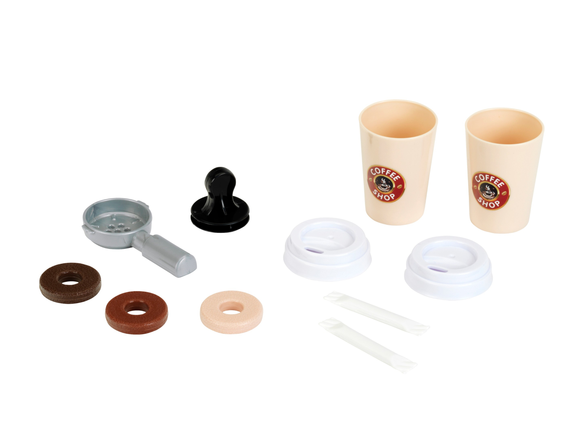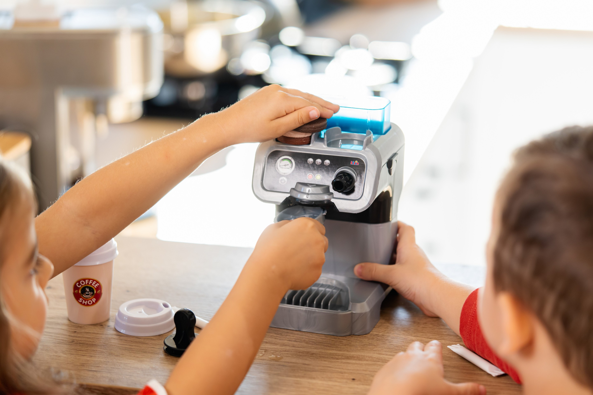 Zestaw Barista wyposażony jest w pojemnik na wodę i funkcję przepływu. Dzieci z przyjemnością częstują swoje lalki, pluszowe misie, a nawet mamę, tatę, babcię i dziadka espresso w swoich kuchniach do zabawy. Ten nowoczesny i przyjazny dzieciom ekspres do kawy idealnie się do tego nadaje: wystarczy napełnić zbiornik wodą, włożyć kapsułkę z kawą, docisnąć ją ubijakiem jak profesjonalny barista, a następnie nacisnąć przycisk włączania. Woda spływa do atrakcyjnej filiżanki niczym fantazyjna kawa i można ją podać. Zabawa dla wszystkich grup wiekowych!