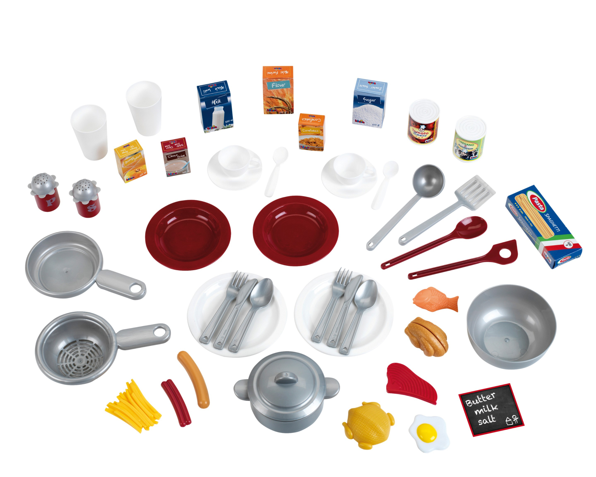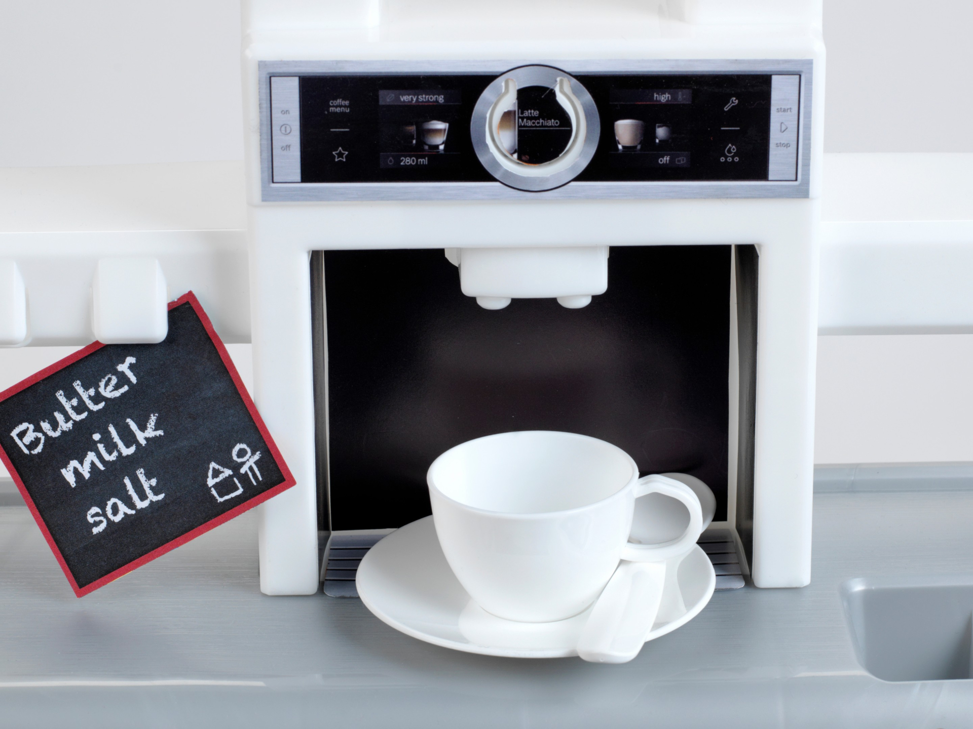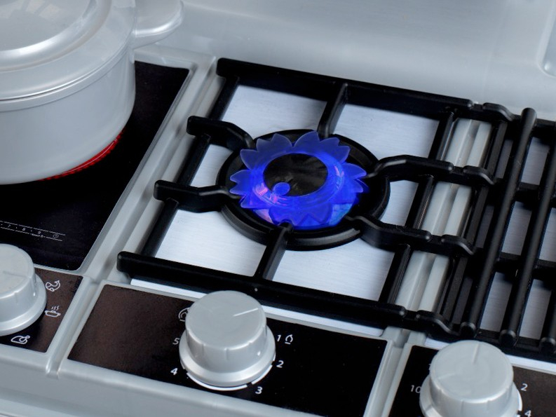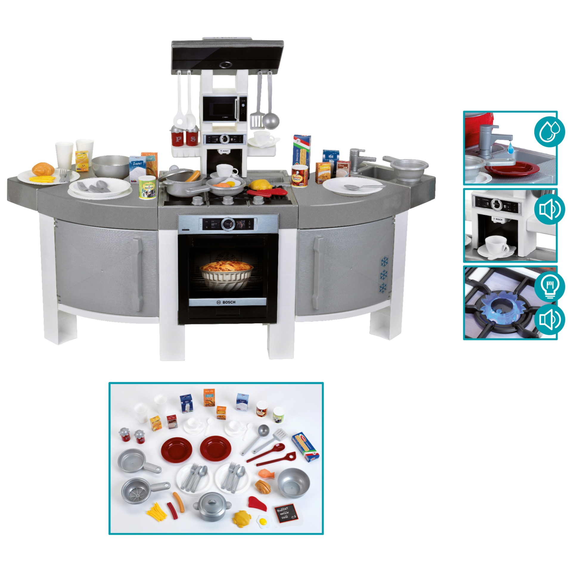 Kuchnia powstała na licencji firmy Bosch, dlatego też jest wierną kopią prawdziwego urządzenia tej marki. Kuchnia jest jednym z największych proponowanych zestawów tej serii. Zabawka ma aż 137 cm szerokości, posiada blat roboczy, imitację płyty indukcyjnej, zlew z baterią, szafkę na akcesoria i zintegrowany stolik z półką na pozostałe przybory i naczynia kuchenne. Zabawa może odbywać się po obu jej stronach, co daje łatwy dostęp do poszczególnych akcesoriów zestawu. Urządzenie posiada imitacje otwieranej lodówki, zmywarki czy piekarnika. Zestaw zawiera aż 47 elementów akcesoriów, przyborów kuchennych, czy naczyń stołowych, a w tym garnek z przykrywką, rondel, patelnię, cedzak, cztery talerze czerwony i kremowy ze sztućcami, dwie czerwone filiżanki z podstawkami i talerzykami na deser, dwa kremowe kubki, chochlę, łyżkę, łopatkę kuchenną, solniczkę, pieprzniczkę, a także imitację opakowań przypraw, cukru, kawy, czy śmietanki do kawy. Na okapie kuchni znajdują się wygodne uchwyty do zawieszenia wszystkich akcesoriów kuchennych. Imitacja elektrycznej płyty kuchni Bosch wydaje odgłos gotowania, gdy tylko ją włączymy i postawimy na niej garnek lub patelnię. Zarówno lodówka, piekarnik jak i zmywarka otwiera się, a ich wnętrze oprócz imitacji lodówki, piekarnika czy zmywarki może także posłużyć jako skrytka na akcesoria kuchenne, które można tam schować i zamknąć po skończonej zabawie. Ponadto kuchnia Bosch posiada jeszcze mały zlew z baterią, do którego możemy wlać wodę. Kuchnia nie nagrzewa się i nie nagrzewa podczas zabawy żadnych przedmiotów które dziecko jest w stanie na niej położyć. Wielkość i waga są dopasowane do potrzeb oraz rączek dziecka. Poprzez gotowanie i zabawę tą kompaktową kuchnią dziecięcą oraz podawanie do stołu dzieci rozwijają swoje umiejętności motoryczne i pobudzają wyobraźnię. Zabawka wymaga użycia baterii, które nie są zawarte w zestawie.