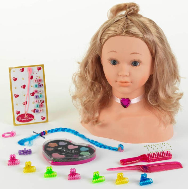 Duża głowa do stylizacji i czesania wielkością i wyglądem przypomina dziecko. Może doskonale służyć do zabawy jak i do nauki dbania o siebie. Jest to świetny pomysł na wspólną zabawę mamy z córką. Głowa ma wysokość 27 cm i jest idealna dla początkujących fryzjerów i wizażystów. Umiejętności motoryczne i kreatywność są ćwiczone poprzez nakładanie makijażu, czesanie i szczotkowanie oraz doczepianie spinek i klipsów do włosów. Włosy głowy są miłe w dotyku i gęste, dzięki czemu wielokrotne ich czesanie i częste układanie fryzury nie ma wpływu na pogorszenie jakości. W skład zestawu wchodzi głowa do stylizacji fryzur i makijażu (włosy można myć i czesać), szczotka, spinki do włosów, zestaw kosmetyków do makijażu, zestaw akcesoriów do włosów,a w nim stylowy zestaw pereł, szykowne spinki do włosów, wsuwki i pasmo włosów syntetycznych. Ponadto opakowanie zawiera liczne akcesoria do układania włosów oraz obrazkowe instrukcje wykonania przykładowych fryzur. Do zestawu dołączony jest zestaw do makijażu, który można wykorzystać zarówno do umalowania zabawkowej głowy, jak i siebie. Błyszczyk do ust, cień do powiek i róż do policzków są przetestowane dermatologicznie. Kolekcja Princess Coralie jest autorską kolekcją marki Klein skierowaną do dziewczynek. Seria oferuje szeroką gamę produktów doskonale uzupełniających się na wzajem. Podczas zabawy dzieci mogą naśladować zaobserwowane w świecie dorosłych sytuacje.