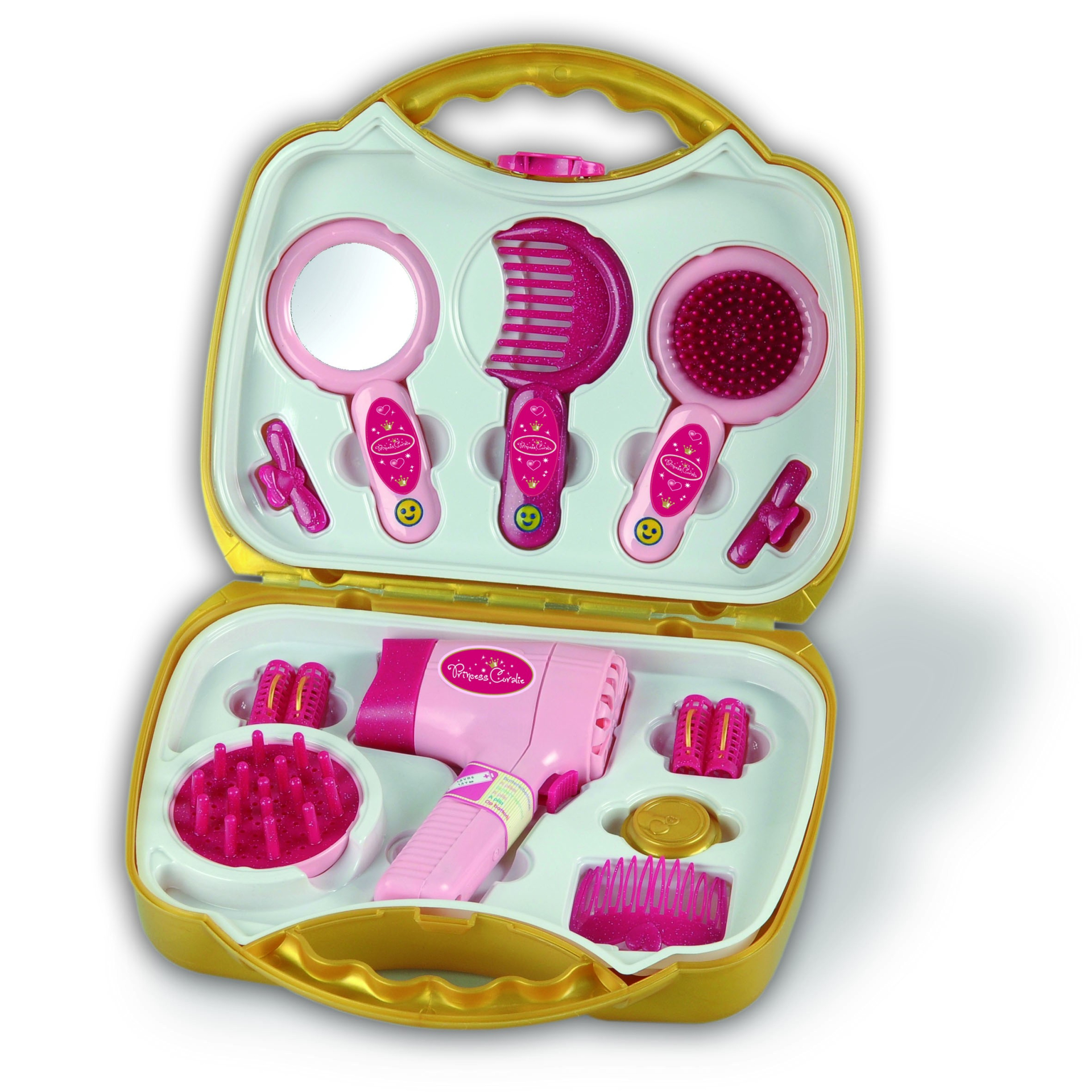 Zestaw fryzjerski do stylizacji zapakowany jest w wygodnej złoto-transparentnej walizeczce. Opakowanie zawiera akcesoria do pielęgnacji i stylizacji, które stanowią doskonały zestaw do zabawy w fryzjera. Suszarka z dołączanym dyfuzorem działa na baterie, a po wciśnięciu przycisku dmucha powietrzem, nie nagrzewając się. Szczotka do włosów, grzebień i wałki do nawijania włosów pozwolą doskonale wymodelować fryzurę, a spinki i ozdobne grzebyki pomogą pięknie ją ułożyć. Świetna zabawa gwarantowana. W zestawie znajduje się suszarka do włosów, dyfuzor, grzebień, szczotka, lusterko, grzebień ozdobny, wałki do włosów – 4szt., pojemniczek imitujący krem, spinki do włosów - 2szt. Grzebień, szczotka, spinki do włosów mają zaokrąglone końcówki, którymi nie można się ukłuć ani skaleczyć, czyli podczas zabawy są bezpieczne. Wszystkie elementy są bardzo wysokiej jakości, są ładnie wykonane, a wielkością dostosowane do dziecięcych rąk. Czesanie włosów grzebieniem, szczotkowanie, suszenie doczepianie spinek doskonale trenuje umiejętności motoryczne i kreatywność. Kolekcja Princess Coralie jest autorską kolekcją marki Klein skierowaną do dziewczynek. Seria oferuje szeroką gamę produktów doskonale uzupełniających się na wzajem. Podczas zabawy dzieci mogą naśladować zaobserwowane w świecie dorosłych sytuacje.