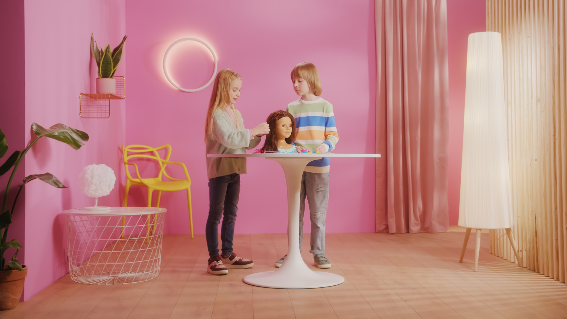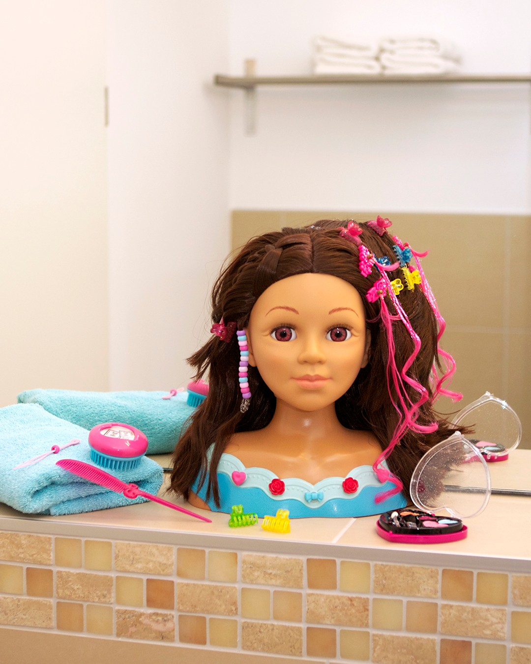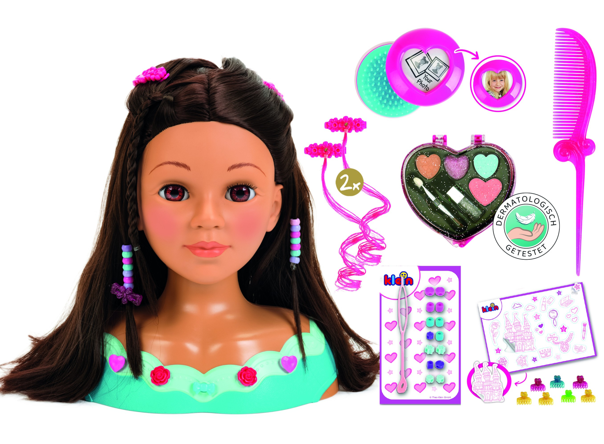 Ładna, 27-centymetrowa głowa do stylizacji włosów dla dzieci, z włosami nadającymi się do mycia i czesania, zawiera dermatologicznie testowany zestaw kosmetyków w kształcie serca oraz akcesoria do włosów. Kosmetyczne serce zawiera błyszczyk do ust, cień do powiek i róż. Zestaw akcesoriów do włosów i przyborów fryzjerskich zawiera szczotkę, grzebień, dwa pasma włosów, zestaw koralików do włosów, siedem spinek do włosów, dwie spinki do beretu, osiem spinek dekoracyjnych do tułowia i spinek do beretu, a także arkusz naklejek, instrukcję ze wskazówkami dotyczącymi stylizacji i wiele więcej.