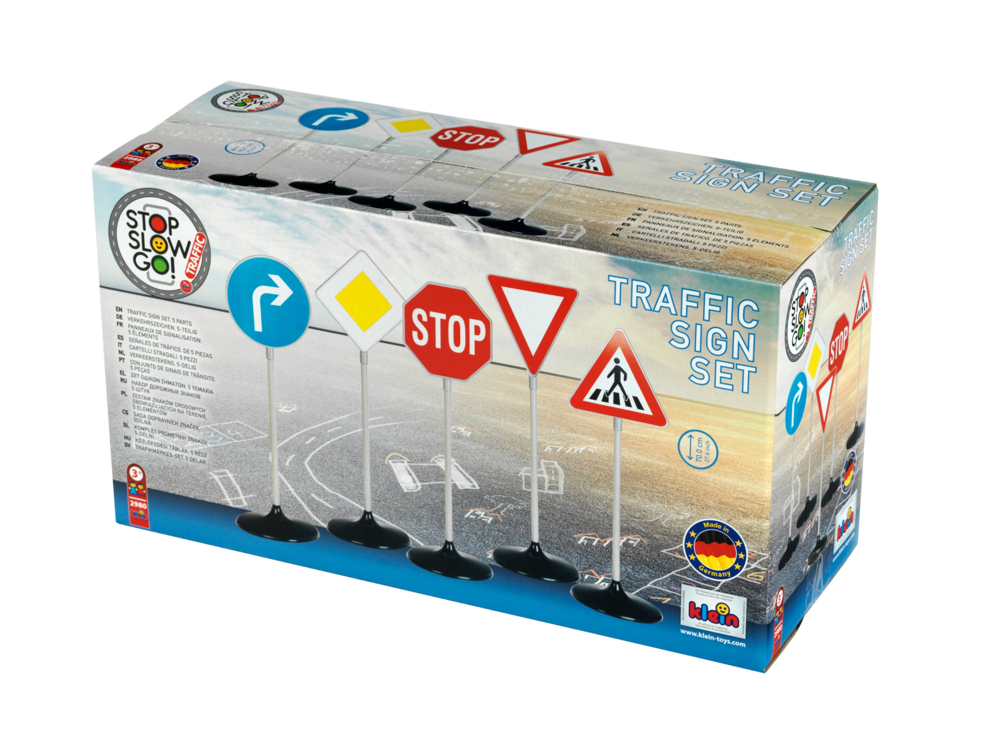 Znaki drogowe duże – zestaw 1 pochodzą z bardzo popularnej serii związanej z bezpieczeństwem ruchu drogowego (BRD), dlatego dają dzieciom wiele możliwości zabawy i nauki. Dzięki tym zabawkowym znakom nauka ruchu drogowego to świetna zabawa w szkole podstawowej, przedszkolu czy na przydomowym podwórku. Znaki mają 73 cm wysokości. Znaki drogowe marki Klein to doskonała zabawa dla początkującego przyszłego kierowcy. Zestaw przedstawia znaki (A-7) Ustąp pierwszeństwa, (A-16) Przejście dla pieszych, (B-20) STOP, (C-2) Nakaz skrętu w prawo, (D-1) Droga z pierwszeństwem Zabawka wykonana jest z wysokiej jakości materiałów i wiernie odzwierciedla prawdziwe znaki drogowe, co z pewnością spodoba się wszystkim dzieciom zainteresowanym tematyką drogową, a ich edukacyjna forma pomoże dzieciom już we wczesnym ich etapie rozwoju poznawać zasady ruchu drogowego.