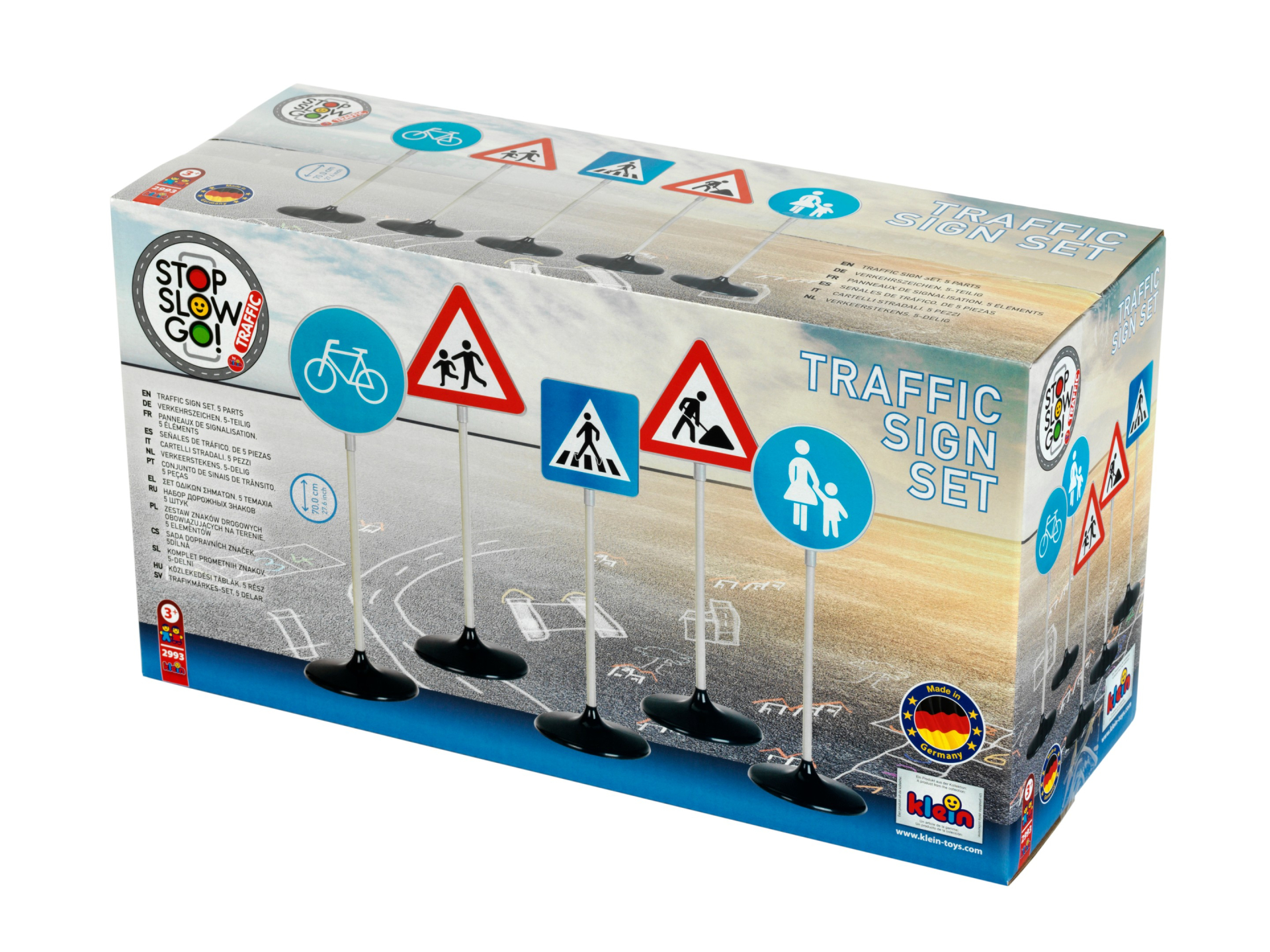 Znaki drogowe duże – zestaw 2 pochodzą z bardzo popularnej serii związanej z bezpieczeństwem ruchu drogowego (BRD), dlatego dają dzieciom wiele możliwości zabawy i nauki. Dzięki tym zabawkowym znakom nauka ruchu drogowego to świetna zabawa w szkole podstawowej, przedszkolu czy na przydomowym podwórku. Znaki mają 73 cm wysokości. Znaki drogowe marki Klein to doskonała zabawa dla początkującego przyszłego kierowcy. Zestaw przedstawia znaki (A-14) Roboty drogowe, (A-17) Dzieci, (C-13) Droga dla rowerów, (C-16) Droga dla pieszych, (D-6) Przejście dla pieszych. Zabawka wykonana jest z wysokiej jakości materiałów i wiernie odzwierciedla prawdziwe znaki drogowe, co z pewnością spodoba się wszystkim dzieciom zainteresowanym tematyką drogową, a ich edukacyjna forma pomoże dzieciom już we wczesnym ich etapie rozwoju poznawać zasady ruchu drogowego.