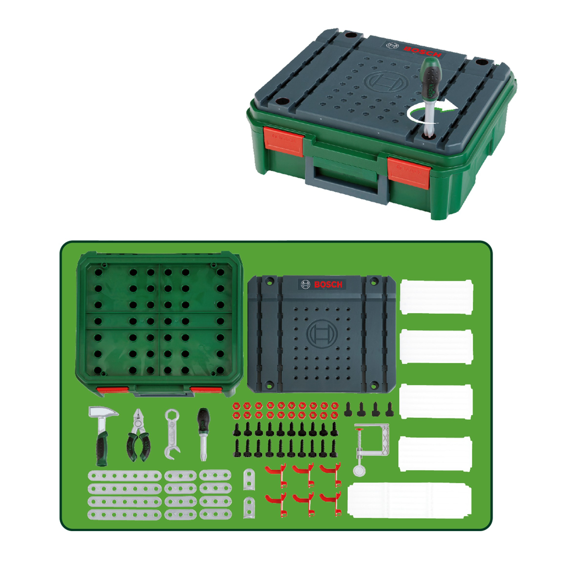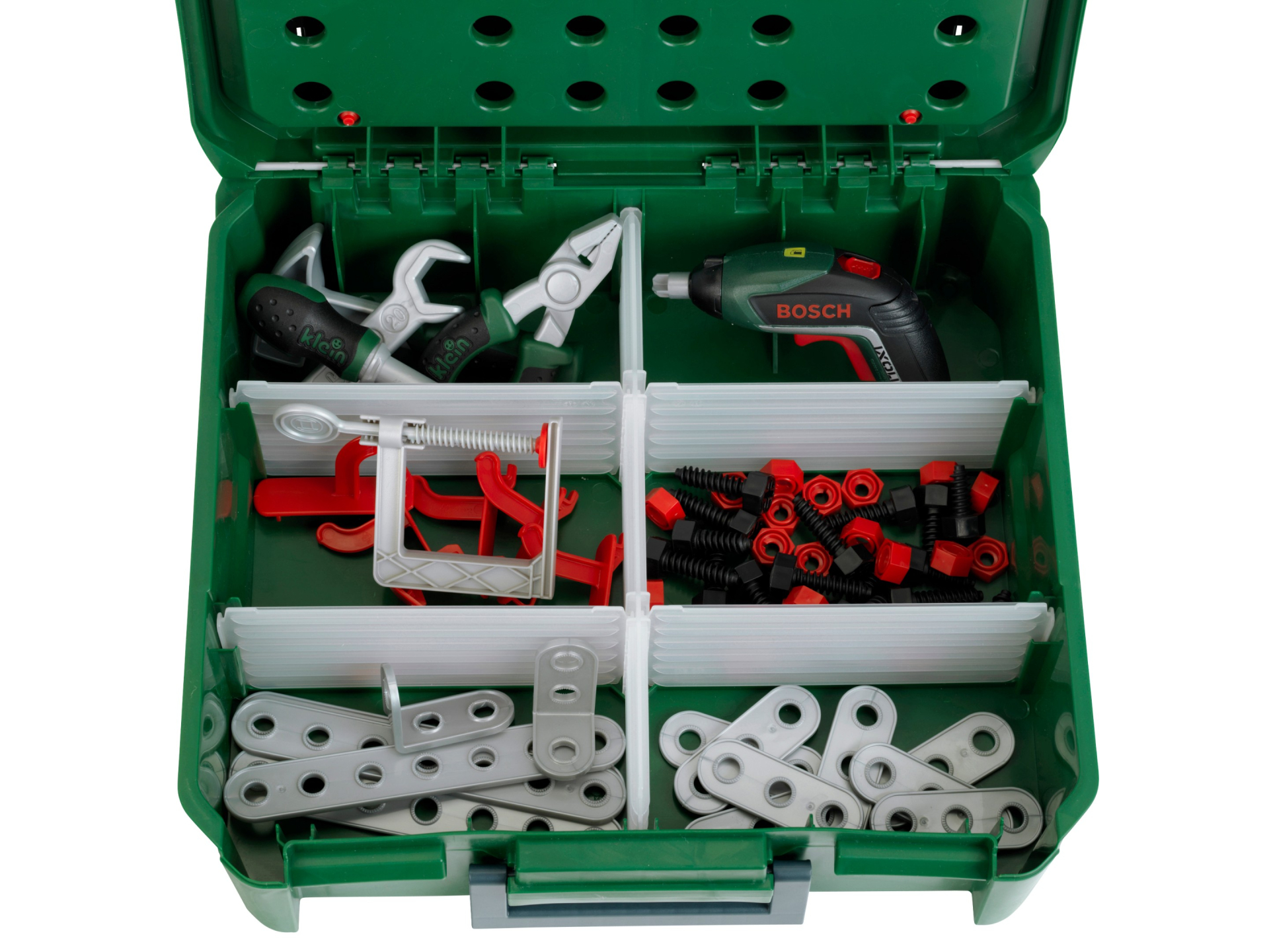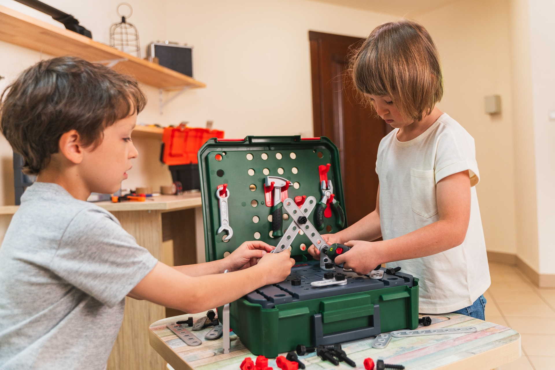Wkręcanie to świetna zabawa – ręcznie lub z wkrętarką Ixolino II firmy Bosch! W tej walizce dzieci znajdą wszystko, czego potrzebują do wkręcania i wykręcania śrub, łączenia listew i tworzenia fascynujących konstrukcji. Wystarczy otworzyć pokrywę i gotowe! Wszystko jest łatwo dostępne w wygodnych dla dzieci, solidnych przegródkach, dzięki czemu początkujący rzemieślnicy mogą wkręcać i wbijać młotkiem na blacie roboczym. Idealny zestaw dla wszystkich małych dzieci, które chcą zbudować lub naprawić coś dużego.